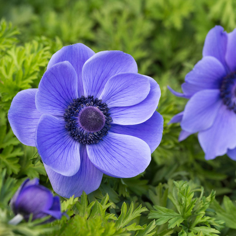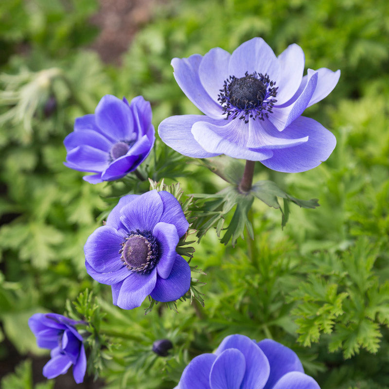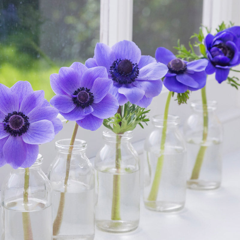 Plant en masse in borders or under trees and shrubs to be rewarded by a delightful show of large, bowl shaped flowers in shades from deep violet to indigo blue with striking black centres. Known as the Florists' Anemone, they make excellent cut flowers to enjoy in the home as well as garden. In colder areas, they will need to be protected with a deep mulch. Will naturalise.