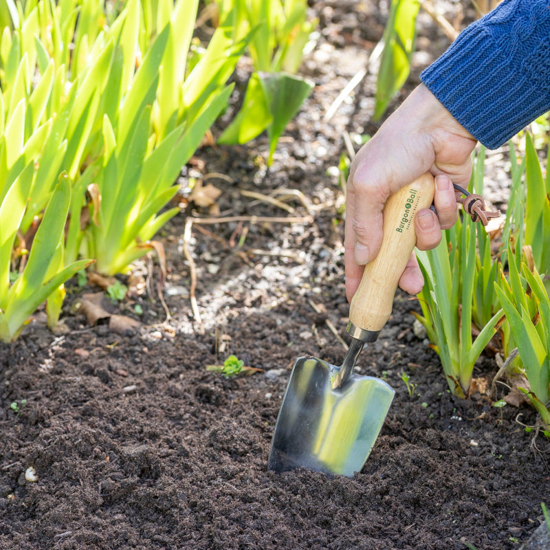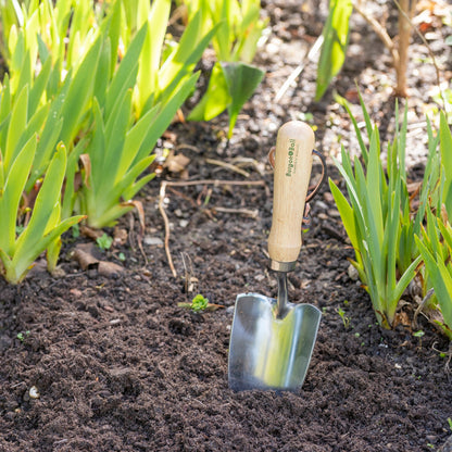 Burgon & Ball Hand Trowel in Stainless Steel with FSC certified hardwood Handle. It's 30cm long with a handy leather cord for hanging.